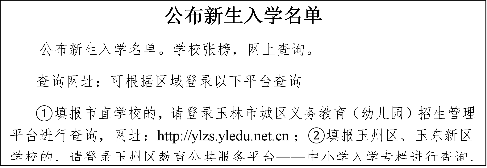 2.方式:登录玉林市城区义务教育(幼儿园)招生管理平台进行查询,网址:http://ylzs.yledu.net.cn。