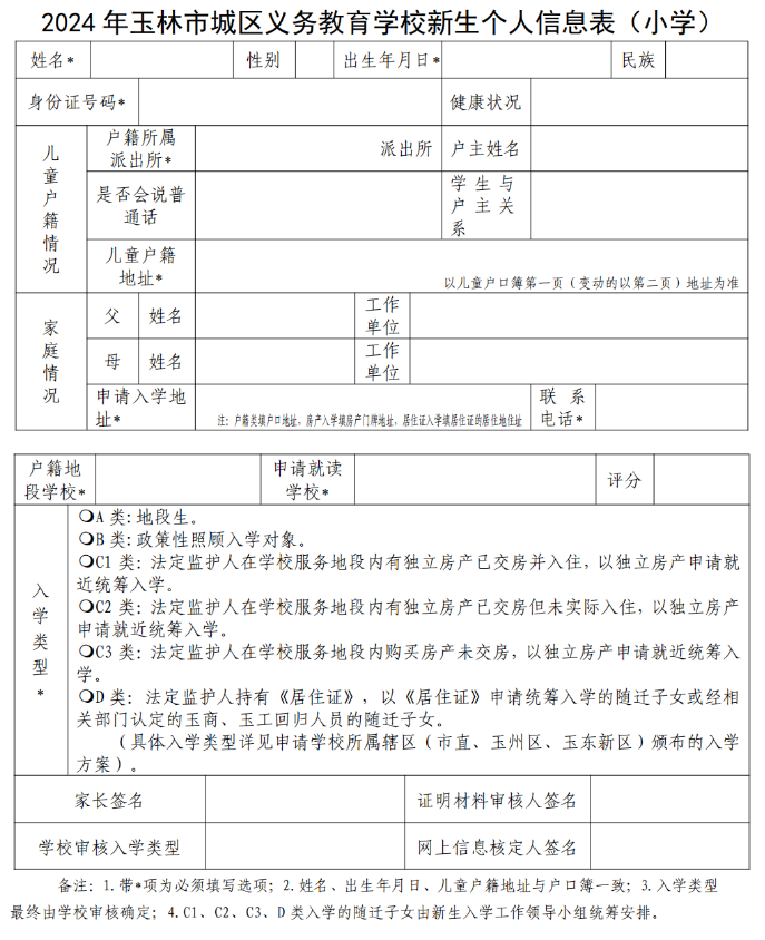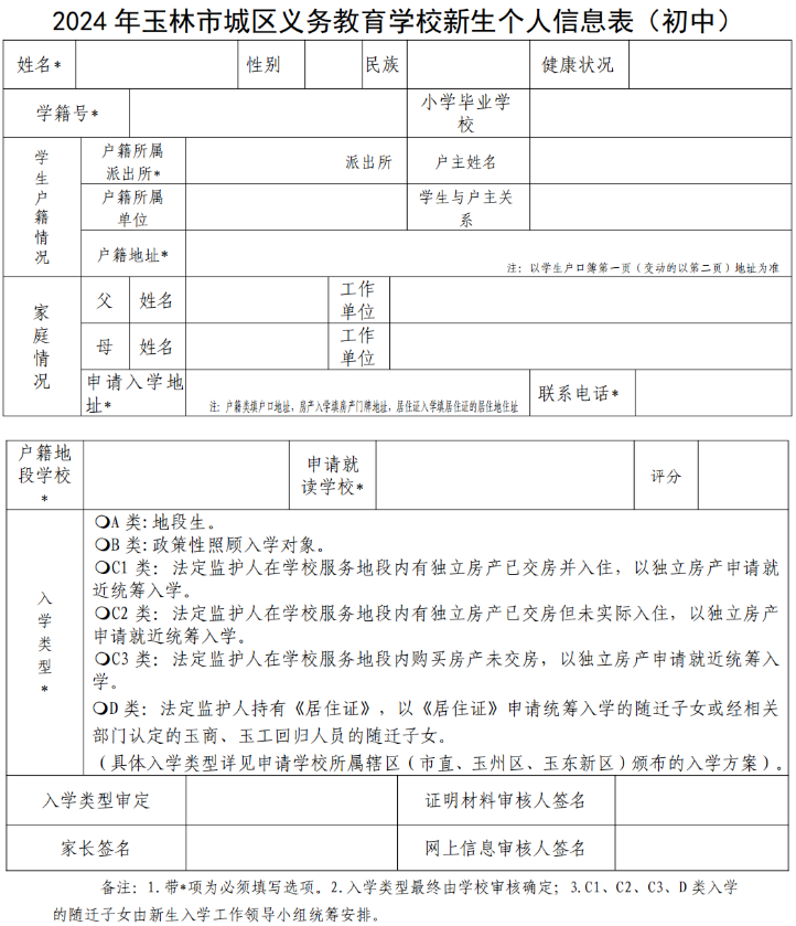 2024年玉林市城区义务教育学校新生个人信息表(初中)