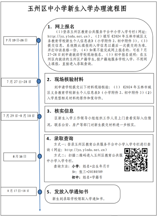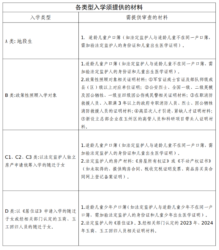 为进一步规范新生入学秩序,健全公平入学长效机制,营造阳光公正的义务教育新生入学氛围,切实保障适龄儿童少年平等接受义务教育的权利,根据《教育部办公厅关于开展义务教育阳光招生专项行动(2024)的通知》(教基厅函〔2024〕11号)、《自治区教育厅关于做好2024年义务教育招生入学工作的通知》(桂教基教〔2024〕27号)、《玉林市教育局关于2024年玉林市城区义务教育学校招生入学工作方案》(玉市教函〔2024〕127号)等文件精神,并结合我区实际情况,特制定本工作方案。(一)坚持依法依规。严格遵守《中华人民共和国义务教育法》等法律法规,严格落实教育部中小学招生“十项严禁”等规定,确保新生入学工作有序高效实施。(二)坚持免试就近入学。按照“户籍地段划片、相对就近、免试入学”的新生入学原则,合理划定新生入学范围,规范办理入学手续。(三)坚持公平公正。全面推行“阳光招生”和“公民同招”政策,采取多种途径宣传新生入学政策,严格规范管理,切实做到政策公开、过程公正、结果公平。(四)坚持均衡发展。严格控制班额,规范编班程序和学籍管理,按照随机方式对学生和教师实行均衡编班,不编重点班、快慢班、实验班,严禁出现“人籍分离”“空挂学籍”“学籍造假”等现象。(五)坚持科学统筹。根据入学对象条件、公办学校学位和就读需求等情况,科学统筹义务教育阶段学校新生入学工作。年满6周岁(即2018年8月31日前出生,含此日),具有玉州区户籍、符合政策性照顾对象条件、符合随迁子女就读条件的适龄儿童。具有玉州区户籍、符合政策性照顾对象条件、符合随迁子女就读条件的小学毕业生。地段生是指户籍在划定学校服务范围内,以户籍申请入学的适龄儿童少年。户籍迁入截止日期为2024年7月10日(含此日)前。适龄儿童的户口簿(如法定监护人与适龄儿童不在同一户口簿,需加验法定监护人的身份证和儿童出生医学证明)。(1)在玉州区内小学毕业的玉州区户籍学生(含在育才中学小学部和玉东新区各小学就读的玉州区户籍小学毕业生),学生入学信息已于毕业前统一由原毕业小学、区中小学新生入学工作领导小组核验户籍地址并划分到相对应的初中。按户籍地址升学的学生,不需提交材料。如果玉州区户籍学生按其它类型申请入学的,请参考其它类型入学办法办理。(2)在玉州区外小学毕业的玉州区户籍学生,如果要求返回玉州区就读初中,请于2024年7月10日前携带学生的户口簿、学籍号到玉州区教育局登记(审查原件,存档复印件),由区中小学新生入学工作领导小组按户籍地址服务学校直接安排到相对应的初中就读(不用网上报名)。(3)符合条件的地段生可享受自治区示范性普通高中定向生待遇。(1)符合条件的现役军人、军烈士、因公牺牲军人、一至四级残疾军人的适龄子女。(2)符合条件的公安烈士、全国一级、二级英模及因公牺牲、一级至四级因公伤残民警的适龄子女。(3)消防救援人员子女:①持有效证件的在职消防救援人员适龄子女;②入职满3年以上的政府专职消防人员适龄子女;③烈士、因公牺牲消防救援人员适龄子女。(4)符合条件的高层次人才、急需紧缺人才的适龄子女。(5)在玉州区连续工作满2年的、有突出贡献的且新设立总部企业在玉州区的高管人员和科研项目带头人的适龄子女。(1)适龄儿童少年户口簿(如法定监护人与适龄儿童少年不在同一户口簿,需加验法定监护人的身份证和儿童少年出生医学证明)。(2)政策性照顾对象相关证明材料:①军官证或士官证及部队师级或县(区)级以上对应单位证明,军烈士、因公牺牲军人、一至四级残疾军人相关证明材料;②公安烈士、全国一级、二级英模及因公牺牲、一级至四级因公伤残民警相关证明材料;③在职消防救援人员、入职满3年以上的政府专职消防人员、烈士、因公牺牲消防救援人员的证明材料;④高层次人才引进、紧缺人才证明材料;⑤新设立总部企业高管人员和科研项目带头人证明材料。1.报名条件:法定监护人在学校服务地段内有独立房产,以房产申请入学。C1类:法定监护人在学校服务地段内有独立房产已交房并入住,以独立房产申请就近统筹入学的适龄儿童少年。C2类:法定监护人在学校服务地段内有独立房产已交房但未入住,以独立房产申请就近统筹入学的适龄儿童少年。C3类:法定监护人在学校服务地段内购买房产但未交房,以独立房产申请就近统筹入学的适龄儿童少年。(1)适龄儿童少年的户口簿(如法定监护人与适龄儿童少年不在同一户口簿,需加验法定监护人的身份证和儿童出生医学证明)。(2)法定监护人的房产材料:《房屋所有权证》或《不动产权证书》(如未取得的,需提供购房合同、税收完税证明发票、商品房买卖合同网上登记备案证明)。现场审核材料后,区中小学新生入学工作领导小组将根据家长填写的信息,在规定时间内组织学校工作人员上门查看实际入住情况。(四)D类:以《居住证》申请入学或经相关部门认定的玉商、玉工回归人员的随迁子女(1)法定监护人持有玉林市公安机关核发的《居住证》,以《居住证》申请就近统筹入学的随迁适龄儿童少年。(2)法定监护人为经相关部门认定的2023年、2024年玉商、玉工回归人员的随迁适龄儿童少年。(1)适龄儿童少年的户口簿(如法定监护人与适龄儿童少年不在同一户口簿,需加验法定监