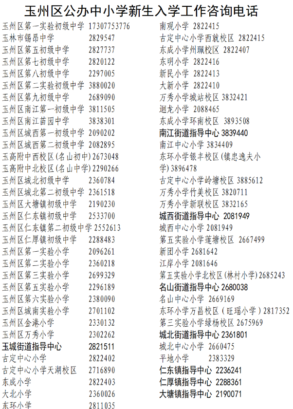 玉州区公办中小学新生入学工作咨询电话