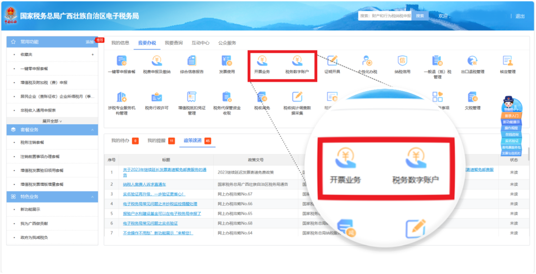 登录广西电子税务局,点击进入【办税功能模块】,在首页—【我要办税】模块—选择【开票业务】或【税务数字账户】。