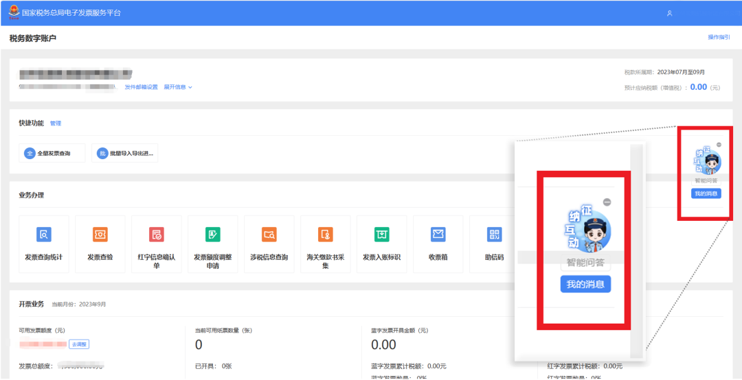 以下以“税务数字账户”为例,跳转税务数字账户界面,在界面右侧“悦悦小浮窗”图标下方点击【我的消息】模块跳转。