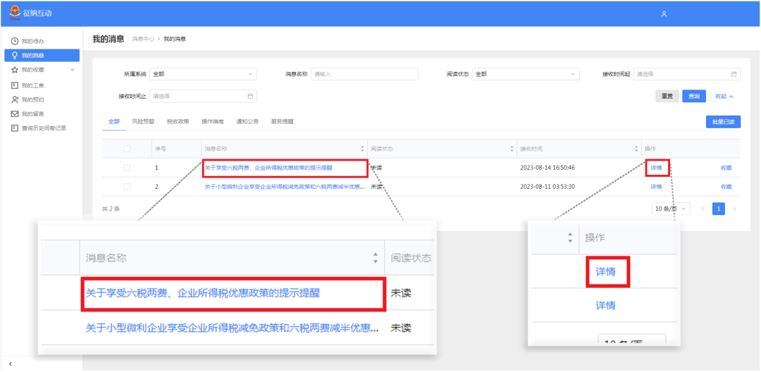 点击【我的信息】跳转至征纳互动—【我的消息】模块,在该页面即可查看到全部的精准推送消息,点击选择标题或点击“详情”操作后可以查看到为您推送的详细内容。