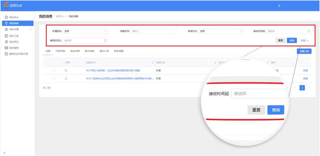 如果您需要精准查找某条推送内容,可以通过页面上方的【所属系统】、【消息名称】、【阅读状态】、【接收时间起止】模块,按需输入查询条件进行查询。