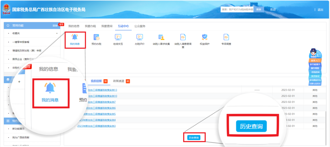 若您需要查看所有的“精准推送消息”,可以在【我的提醒】模块将页面拉至最后,点击“历史查询”,或是电子税务局首页—【互动中心】模块—选项【我的消息】跳转页面。