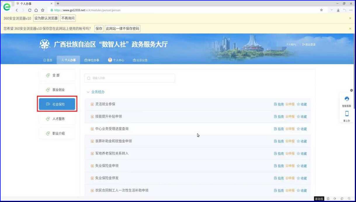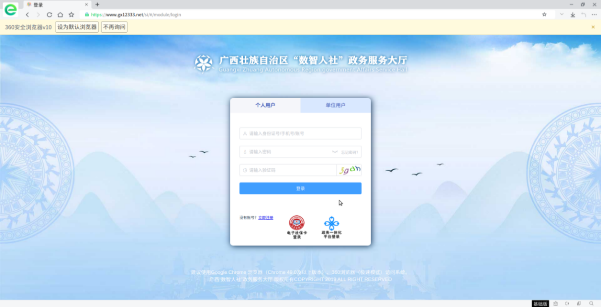 第一步:符合转移条件的申请人员可登录“广西‘数智人社’政务服务大厅”(网址:https://www.gx12333.net/si/#/modules/home/home)注册用户并登录。