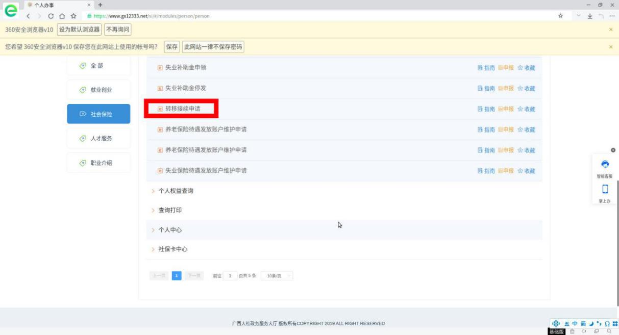 第二步:选择“个人办事—社会保险—转移接续申请”,点击“申报”进入转移申请界面。