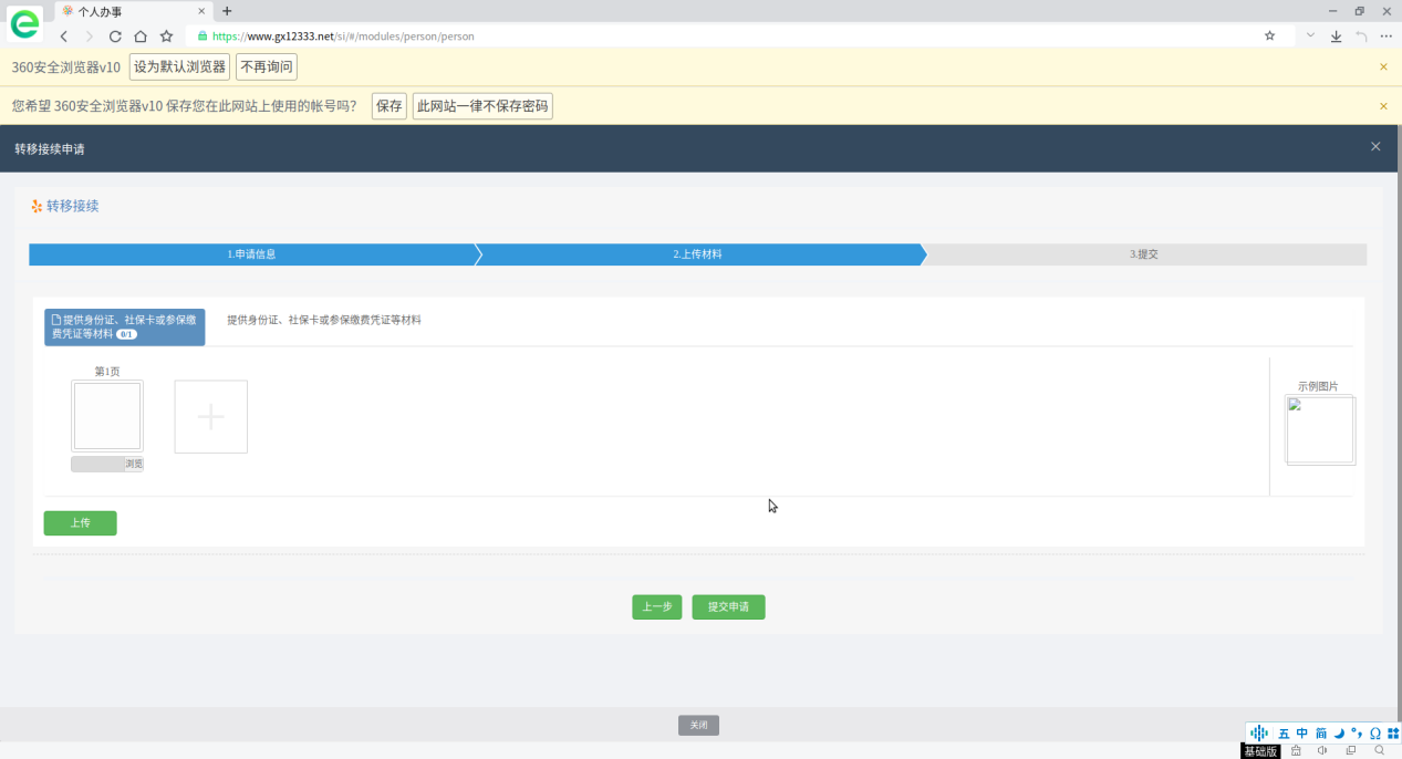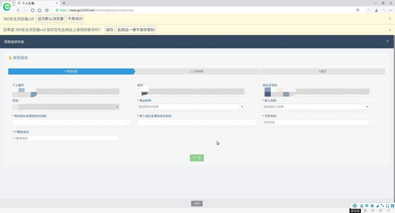 第三步:填写个人信息及转移申请相关信息,点击“下一步”上传身份证、社保卡或个人缴费凭证等材料,上传完毕后点击“提交申请”即可。
