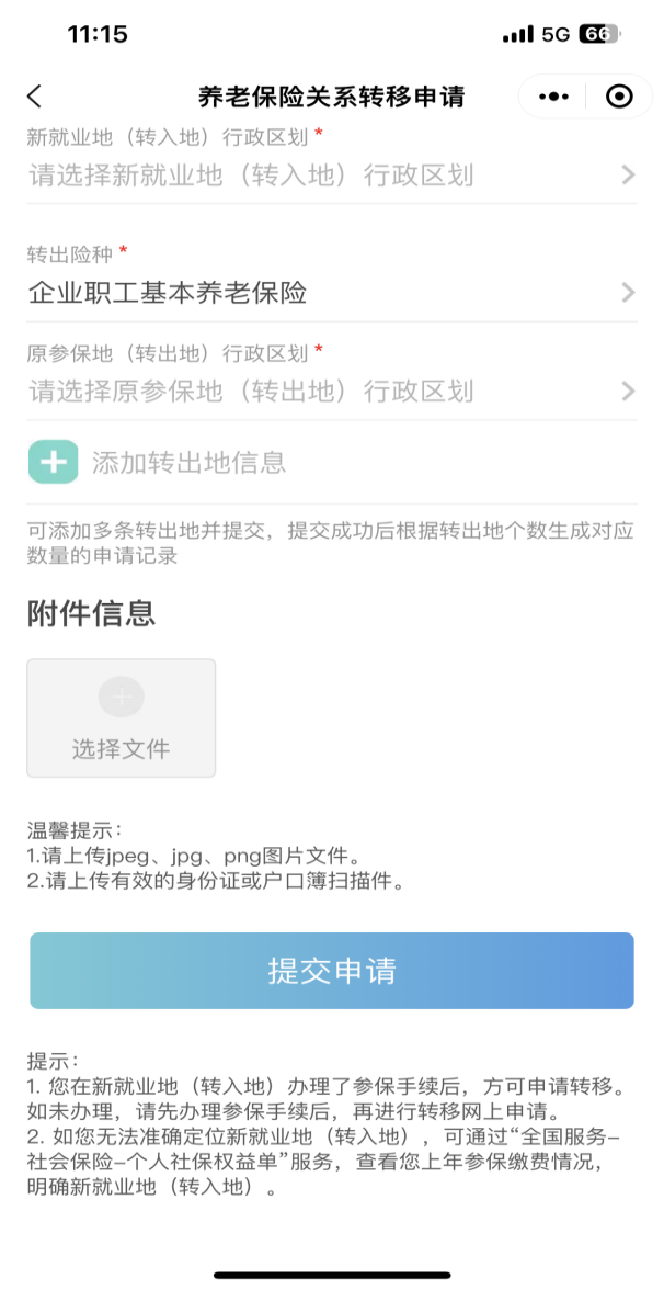 第三步:填写个人信息及转移申请相关信息,并在“附件信息”处上传有效的身份证或户口簿扫描件,上传完毕后点击“提交申请”即可。