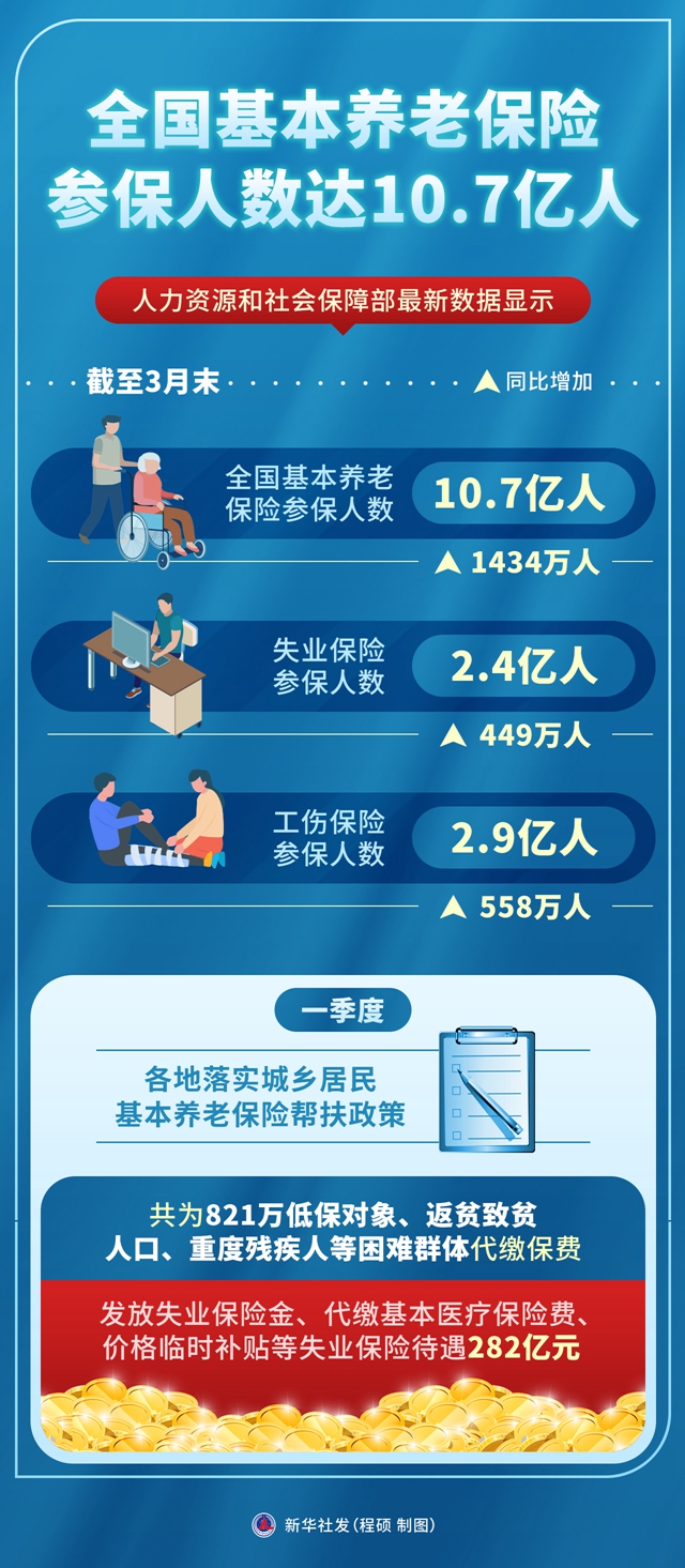 人力资源和社会保障部最新数据显示,截至3月末,全国基本养老、失业、工伤保险参保人数分别为10.7亿人、2.4亿人、2.9亿人,同比分别增加1434万人、449万人、558万人。