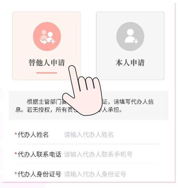 进入本人申请/替他人申请(代办需输入代办人的信息并签字)