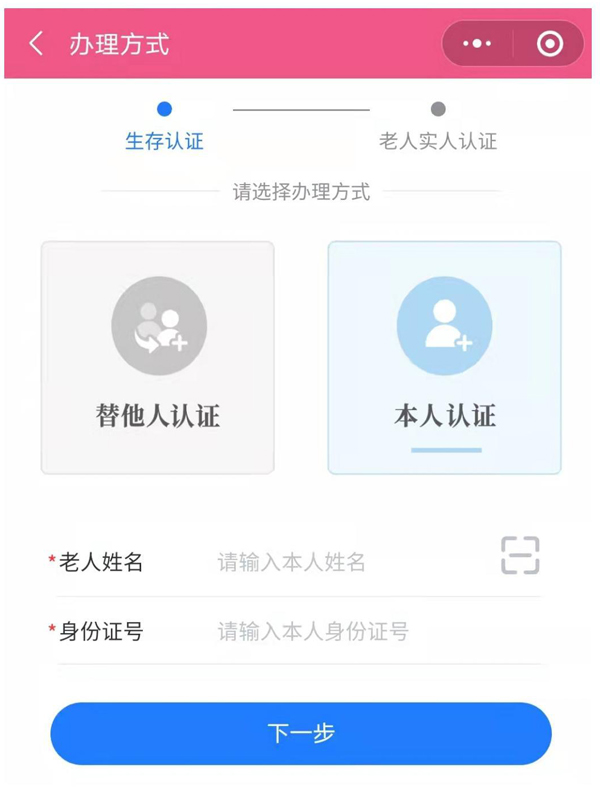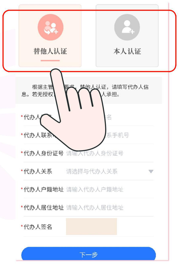 进入本人认证/替他人认证(代办需输入代办人的信息并签字)