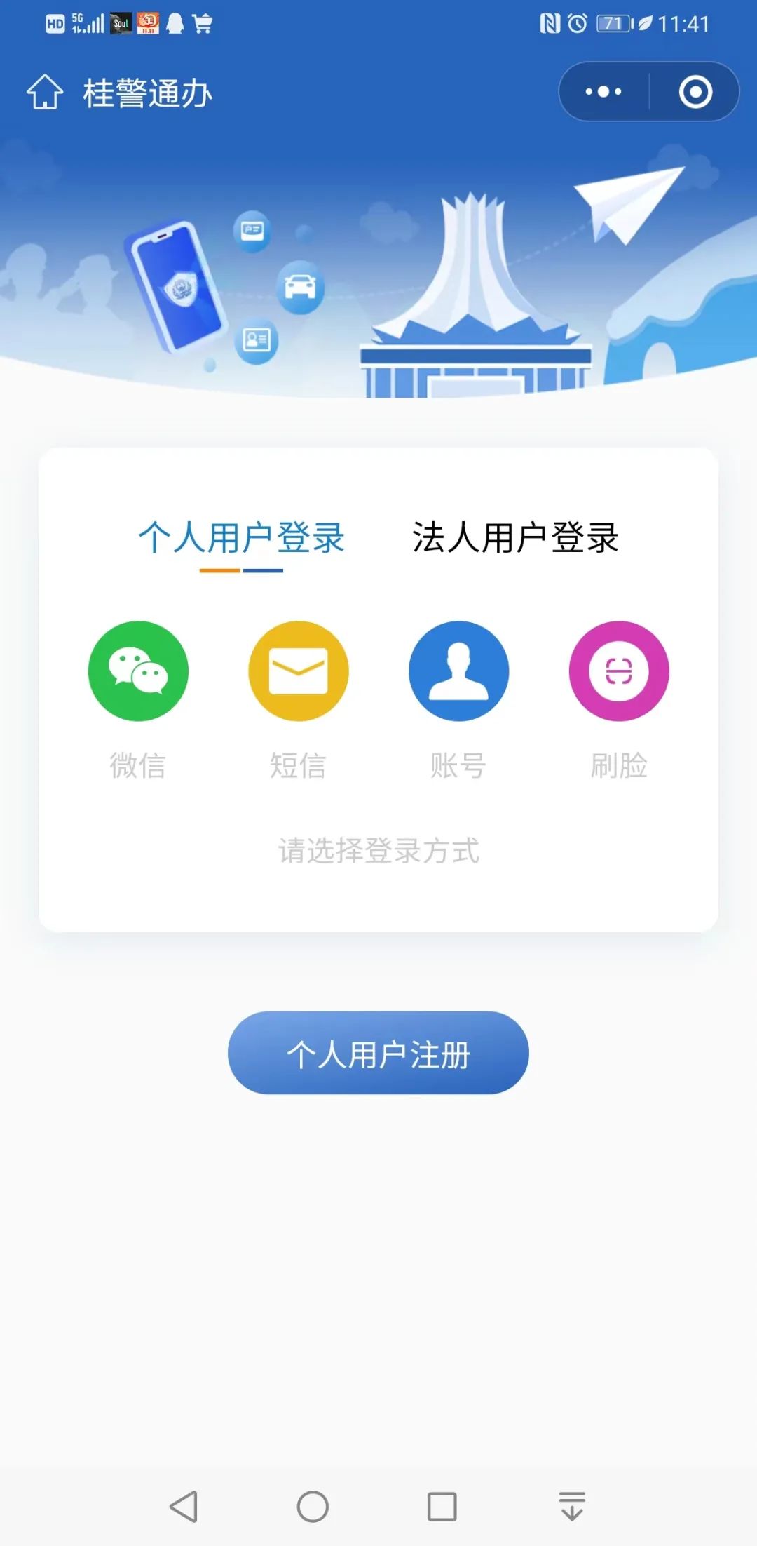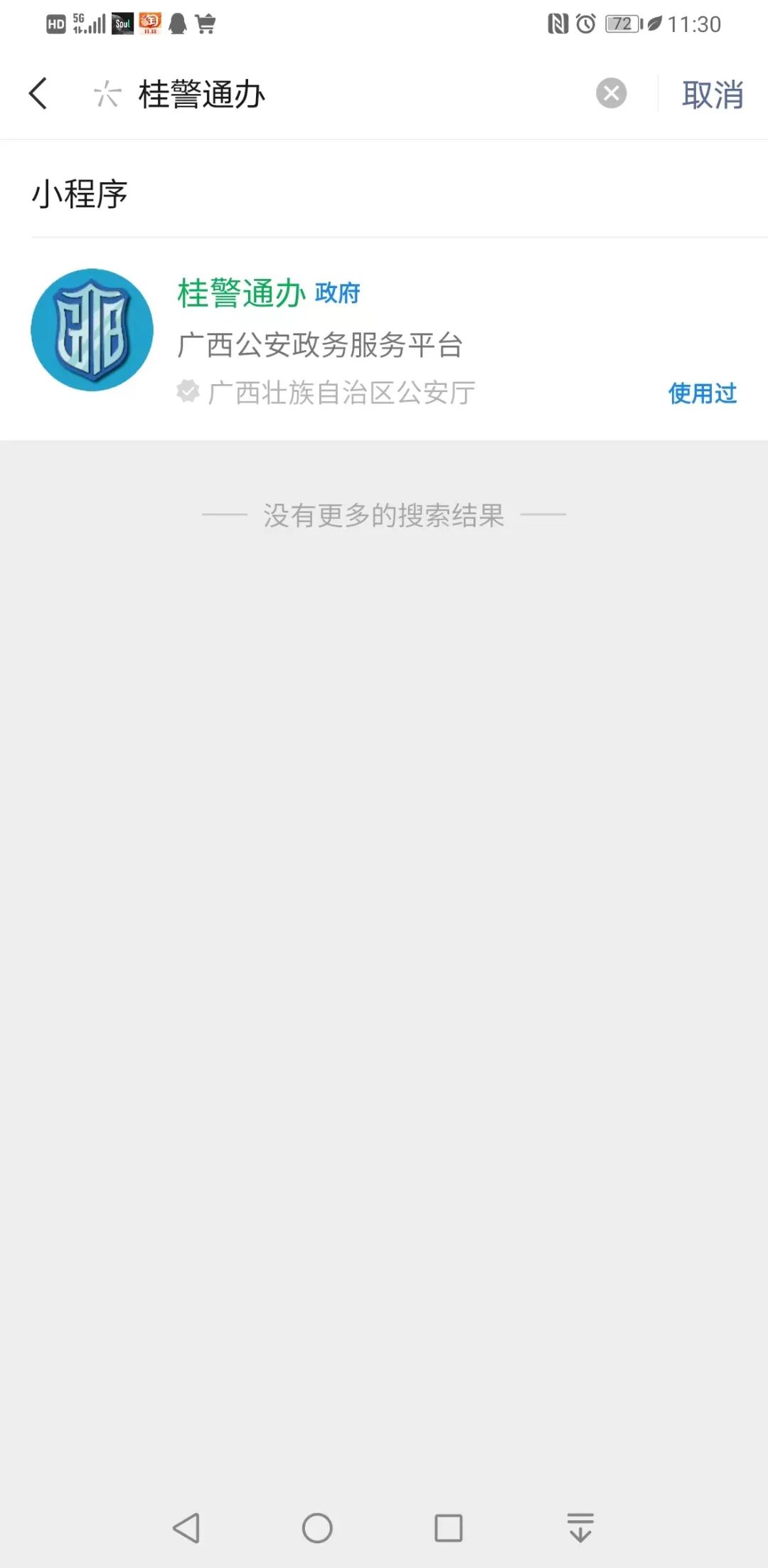 打开微信搜索“桂警通办”,点击对应名称的小程序即可进入桂警通办首页,如下图: