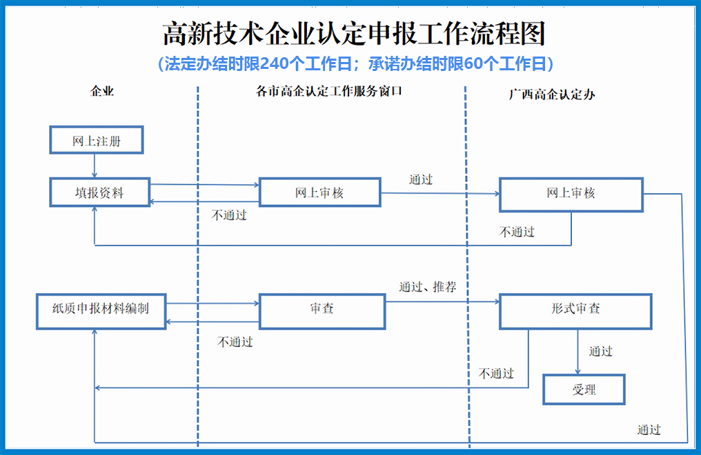 高新技术企业认定申报主要包括网上申报、纸质材料编制及受理等工作流程,由申报企业、各市高新技术企业认定单位服务窗口和广西高企认定办分别完成网上注册和申报、申报材料编制和报送、网上审核和审查以及申报材料受理等具体工作。请申报单位参考《广西高新技术企业认定申报工作规程》(点击查阅)办理 。