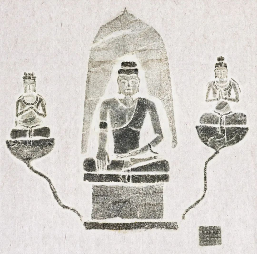 高287厘米,宽304厘米。尖楣拱龛,龛内高浮雕一佛二胁侍菩萨造像3尊,均为坐像。