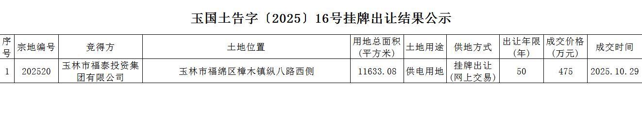 玉国土告字〔2025〕16号挂牌出让结果公示
