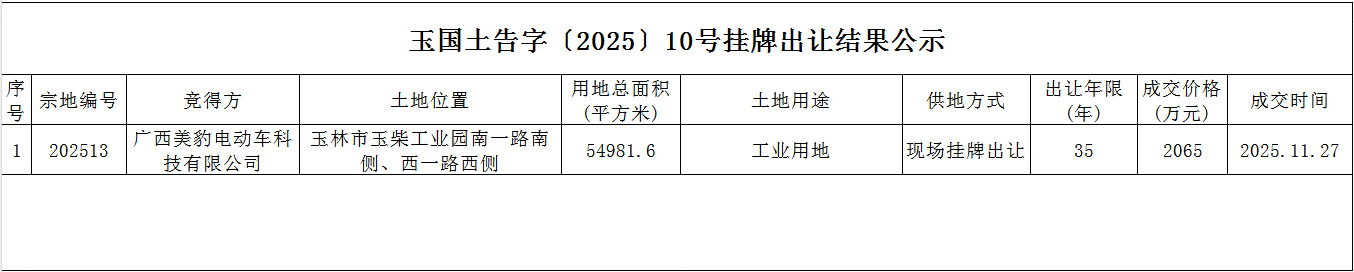 玉国土告字〔2025〕10号挂牌出让结果公示