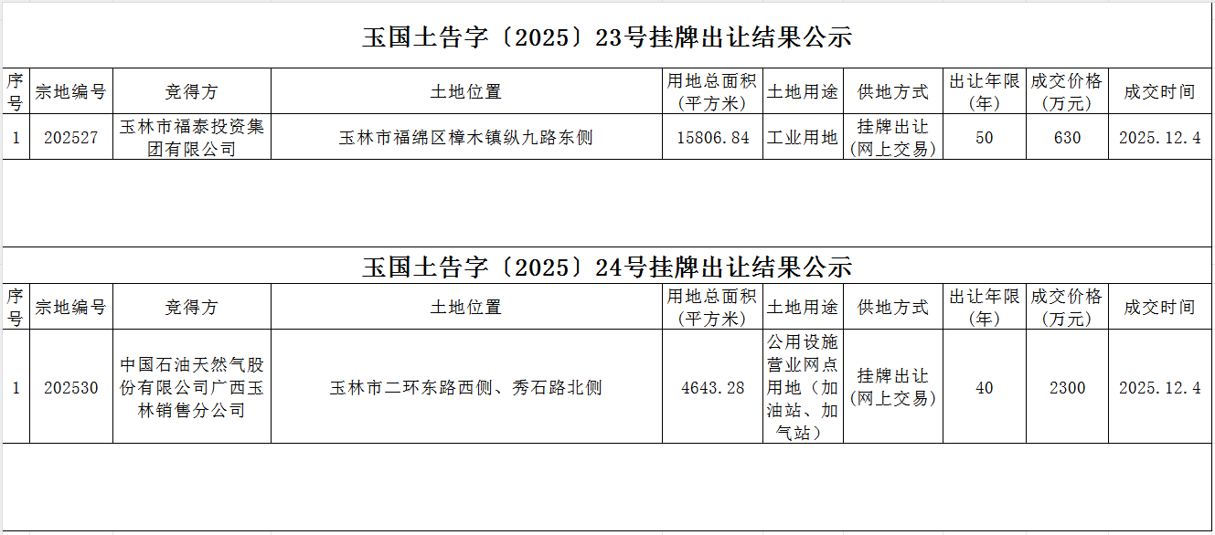 玉国土告字〔2025〕23号,玉国土告字〔2025〕24号,挂牌出让结果公示挂牌出让结果公示