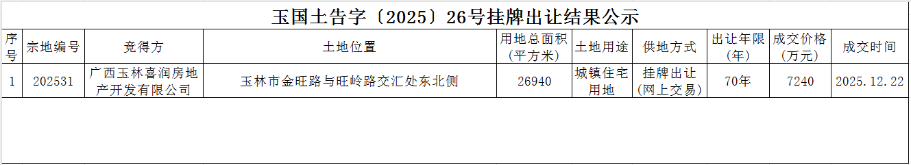 玉国土告字〔2025〕26号挂牌出让结果公示