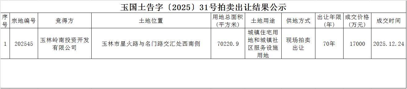 玉国土告字〔2025〕31号拍卖出让结果公示