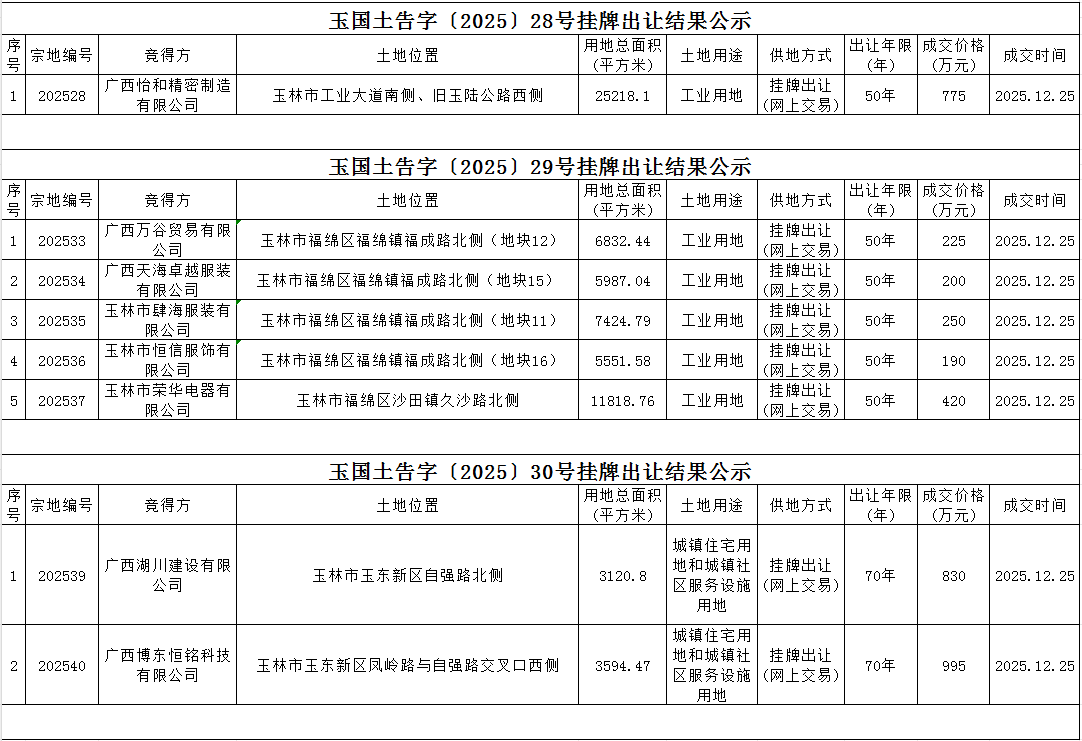 玉国土告字〔2025〕28号、29号、30号挂牌出让结果公示