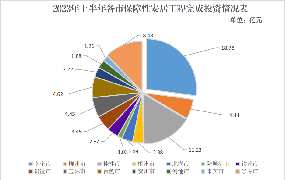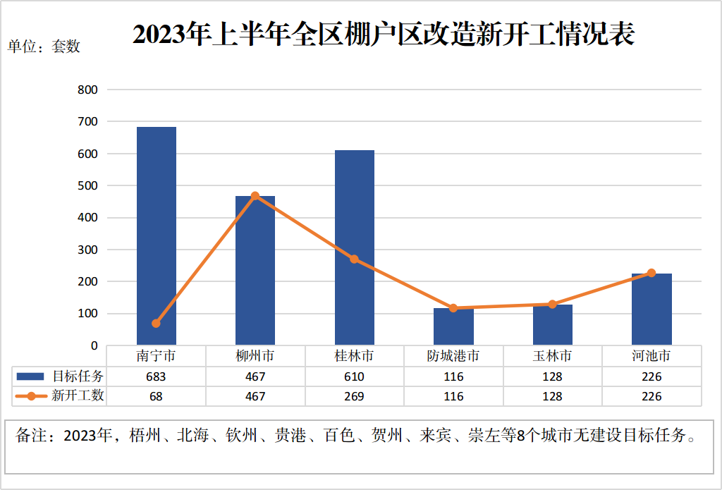 ⒈全区棚户区改造新开工目标任务完成情况。2023年,全区棚户区改造新开工目标任务为2230套。截至6月底,已开工1274套,完成年度目标任务的57.1%。其中,柳州、防城港、玉林、河池市等设区市均已全部实现开工,进度较慢的桂林市开工率为44.1%,南宁市开工率为10%。