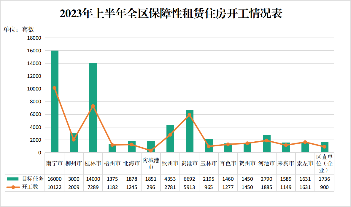 ⒈全区公租房新开工目标任务完成情况:2023年,我区实施新筹集公租房计划的设区市为桂林市,年度新开工目标任务为409套;截至6月底,桂林市已开工268套,完成年度目标任务的65.5%。