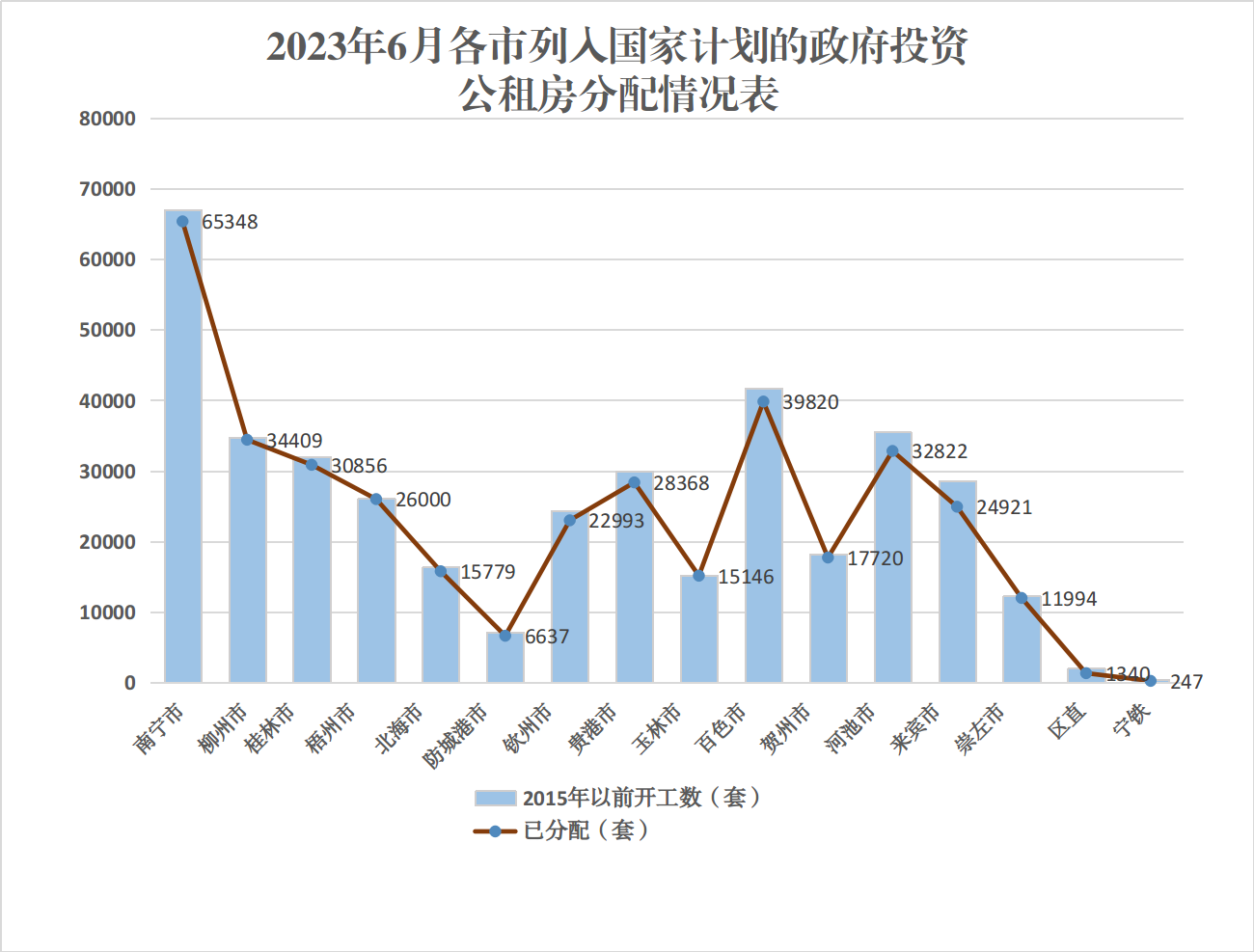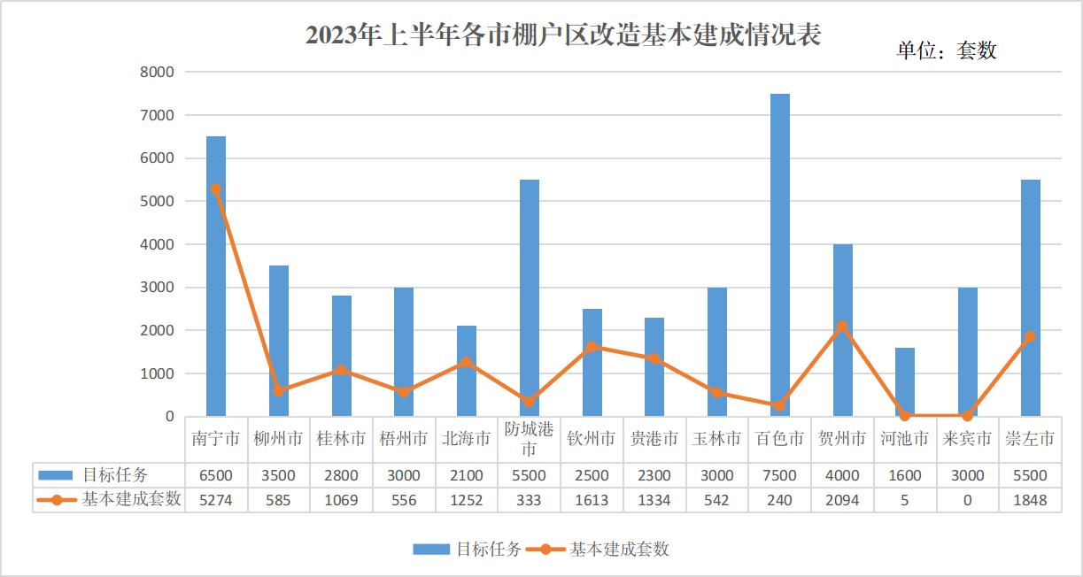 ⒉全区棚户区改造项目基本建成情况。2023年,全区棚户区改造基本建成目标任务为52800套。截至6月底,已基本建成16745套,基本建成率为31.7%,基本建成进展仍然偏慢。其中,除南宁市(基本建成率81.1%)、钦州市(基本建成率64.5%)、北海市(基本建成率59.6%)、贵港市(基本建成率58.0%)、贺州市(基本建成率52.4%)等设区市建设进度过半以外,其余各市基本建成进度均不理想,来宾市基本建成率为零。