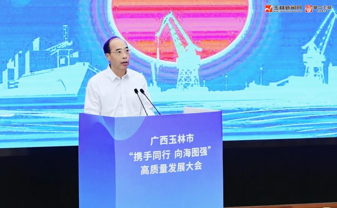 张惠强在讲话中说,玉林与海洋的缘分已经延续千年。自古代海上丝绸之路经玉林出海、连通世界以来,一代又一代的玉林人漂洋过海,用脚步丈量世界、以商道连接文明,铸就了“千年商埠”的商史传奇。现在的玉林,是一座新的沿海城市,玉林海港码头已建成通航和对外开放,我们大力发展临港工业,构建现代化产业体系,全面推进“玉商玉企玉品出海”,玉林正以前所未有的决心和力度,打通向海而兴、向海图强的大通道,拓展临港产业的全新版图。党的二十届四中全会为“十五五”时期发展擘画了蓝图,我们要胸怀“国之大者”,准确把握向海图强的战略指引,壮大产业规模,全力锻造向海图强的硬核支撑,深化开放合作,全面拓宽向海图强的广阔空间,坚持创新驱动,加快点燃向海图强的强劲引擎,厚植发展沃土,充分激发向海图强的市场活力,携手砥砺奋进,广泛凝聚向海图强的磅礴力量,奋力谱写中国式现代化玉林篇章。