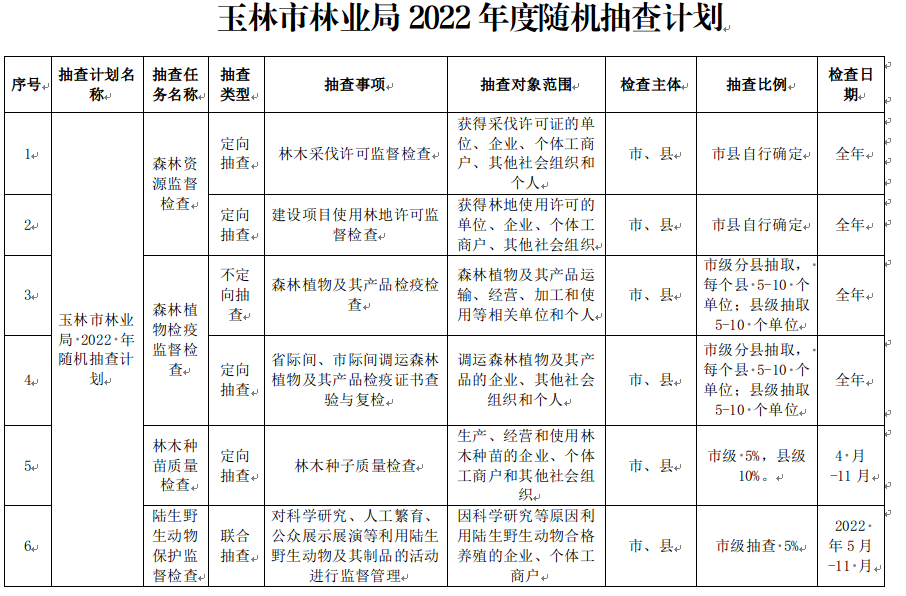根据《玉林市“双随机、一公开”监管局际联席会议办公室关于印发<玉林市政府部门联合抽查事项清单(第四版)>等4个文件的通知》(玉市监函〔2022〕71号)精神,为切实做好2022年“双随机、一公开”工作,现将《玉林市林业局2022年度随机抽查工作计划》印发给你们,请各单位积极配合,抓好落实。