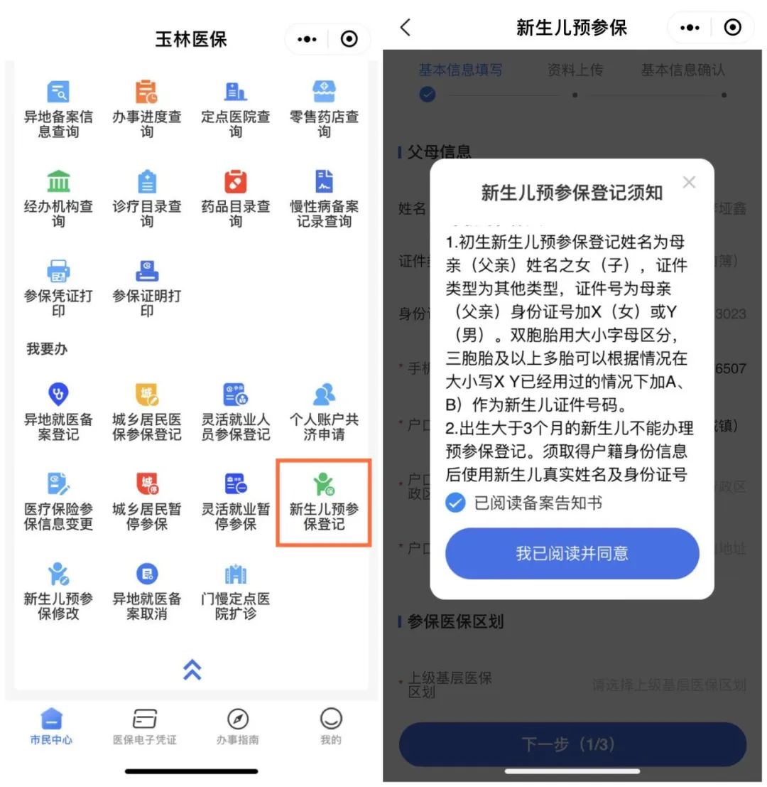点击“玉林医保小程序”—进入“我要办”—“新生儿预参保登记”