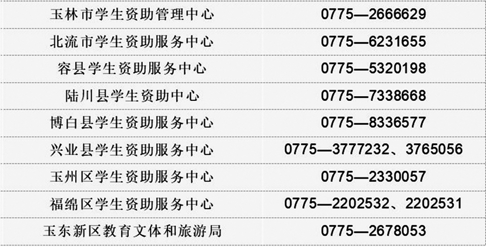 在申贷办理过程中如需要帮助,借款学生或共同借款人可致电国家开发银行承办的生源地信用助学贷款全国统一服务热线95593,也可拨打玉林市各级学生资助管理部门电话,具体如表: