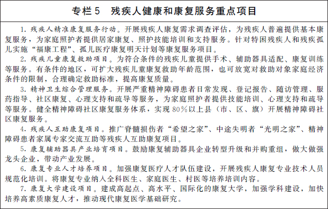 4.加快科技创新和人才培养。将科技助残纳入科技强国行动纲要,促进生命健康、人工智能等领域科学技术在残疾人服务中示范应用,开展残疾预防、主动健康、康复等基础研究,扶持智能化康复辅助器具、康复设备、盲文数字出版、无障碍等领域关键技术研究和产品推广应用。利用现有资源研究设立康复国家重点实验室,鼓励企业、高校、科研院所等参与残疾人服务科技创新和应用。推动建立从中职、高职到本科、硕士、博士等较为完整的残疾人服务相关专业人才培养体系,鼓励有条件的职业院校和普通本科院校增设康复治疗、康复工程技术、特殊教育、手语、盲文等相关专业,加强残疾人服务从业人员职业能力建设和职称评定,加快培养残疾人康复、教育、就业、托养照护、文化、体育、社会工作等专业人才队伍。