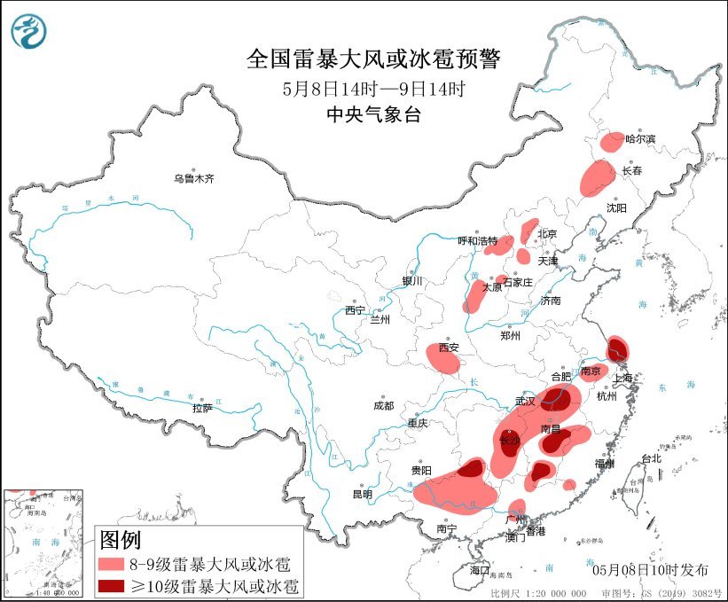 预计5月8日14时至9日14时,华北、东北地区、江汉东部、江淮、江南、华南等地的部分地区将有8级以上雷暴大风或冰雹天气,其中,安徽南部、江苏东南部、湖南东部、江西中北部、广西北部、广东西北部等地的部分地区将有10级以上雷暴大风,最大风力可达11级以上,江西中北部等地局地不排除出现龙卷的可能;华北、江汉东部、江淮、江南、华南等地的部分地区将有小时雨量大于20毫米的短时强降水天气,其中,河北中部、江苏中部、湖南东南部、江西中部、浙江西南部、福建西北部、广西北部、广东等地的部分地区小时雨量大于50毫米,最大可达80毫米以上。