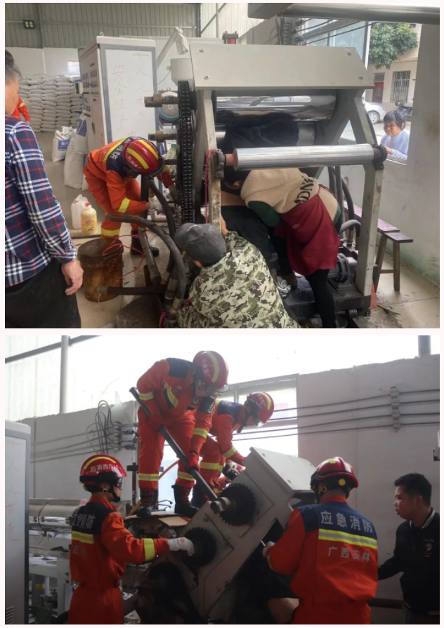 据了解,该名工人当时正在操作机器工作,由于塑料压入机器内时走神,被困者双手被塑料膜顺带着吸附卷进机器,造成双手被卡,事故发生后,在场员工立即对机器断电处置,并拨打报警电话进行求助。消防部门提醒:机械伤害是常见的事故伤害类型,多发生在生产加工、机械操作等环节,开始操作前,必须认真检查防护装置是否完好、制动装置是否灵活和安全可靠,多人操作时,必须相互协调配合好,并确定专人负责指挥。