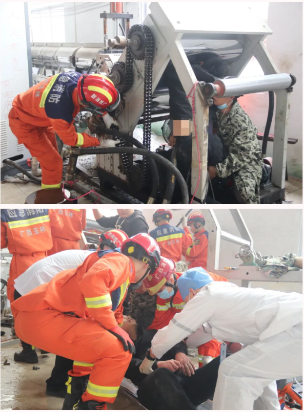 2023年2月16日9时44分左右,博白县亚山镇一工厂发生意外,一人双手被卡入机器中;接到报警后,博白县消防救援大队立即赶赴现场处置。
