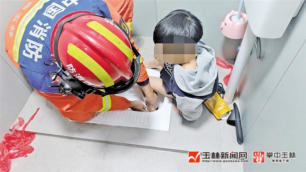 原标题:5岁男孩脚卡便池 消防员砸“坑”解救