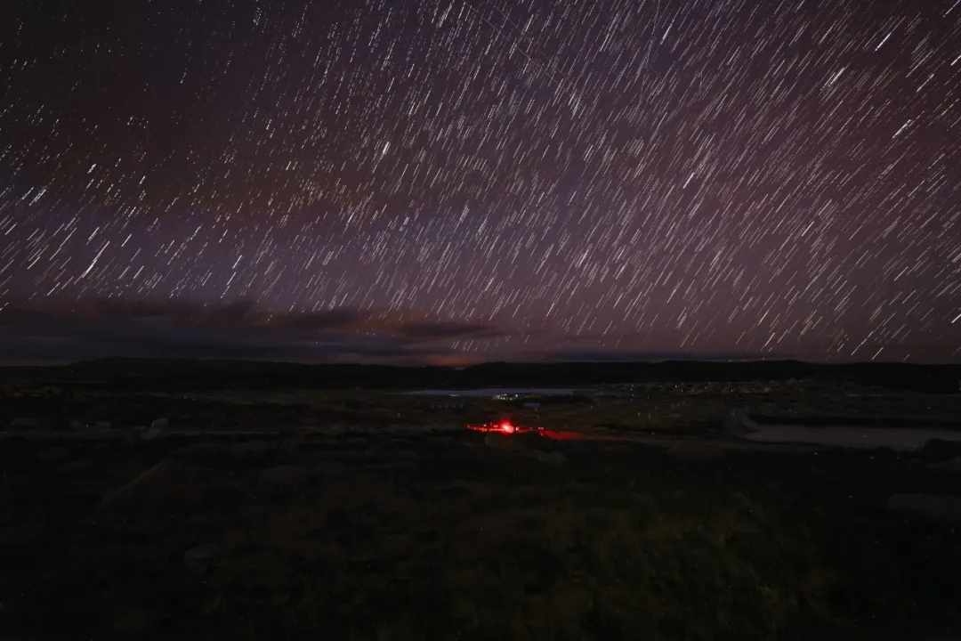 这是2023年4月21日晚拍摄的星空下的高海拔宇宙线观测站“拉索”(LHAASO)(合成照片)。