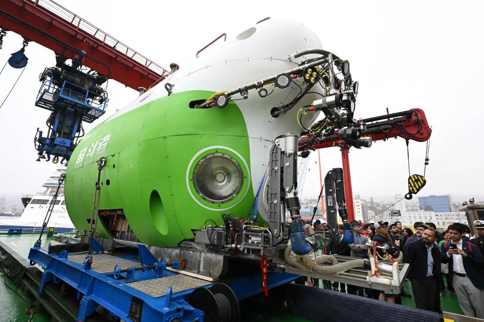 2026年1月19日,在停靠于智利中部瓦尔帕莱索港的中国“探索一号”科考船上,人们参观“奋斗者”号载人潜水器。新华社发(豪尔赫·比列加斯 摄)