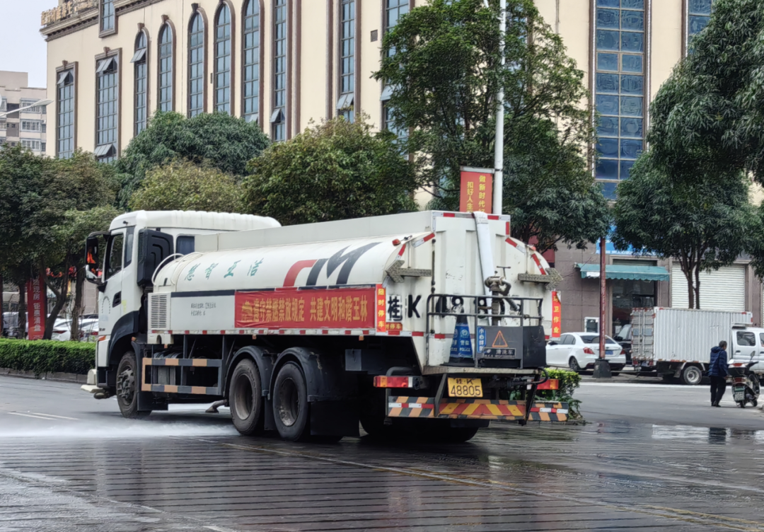 为确保春节期间禁燃禁放规定落到实处,玉林市环卫部门坚持宣传力度不减、管控标准不降。在日常清运和保洁作业中,洁亚、宜美两家服务公司所有一线洒水车、垃圾清运车、扫地车等大型作业车辆上,均悬挂醒目的禁燃标语并持续在城区巡回,时刻提醒广大市民自觉遵守禁燃规定,共同守护城市蓝天。
