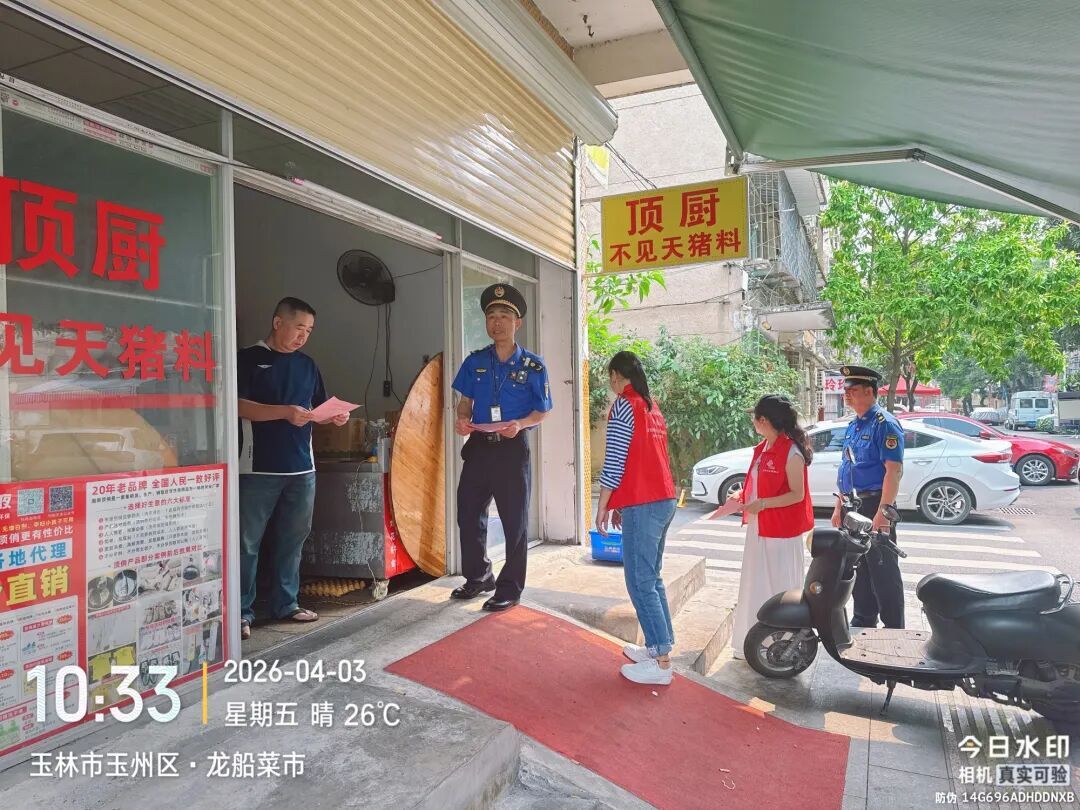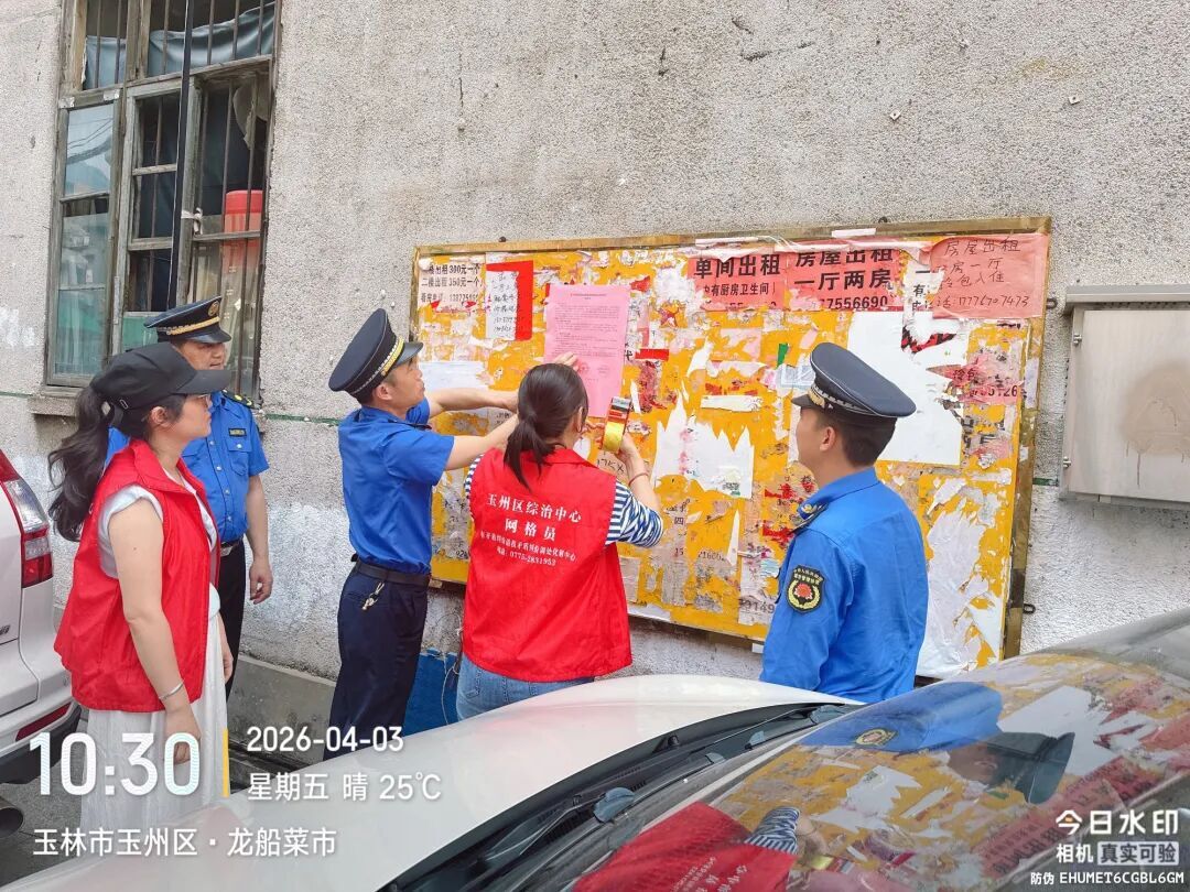 玉州城管大队执法人员充分发挥“城管进社区”平台,与社区工作人员上门宣传《中华人民共和国民法典》及《城市市容和环境卫生管理条例》等法律法规,执法人员耐心细致解读私设地锁的危害,争取群众理解与支持,引导市民自行整改,并发放《关于限期清理龙船里范围内私设地锁的告知书》共 30 份。