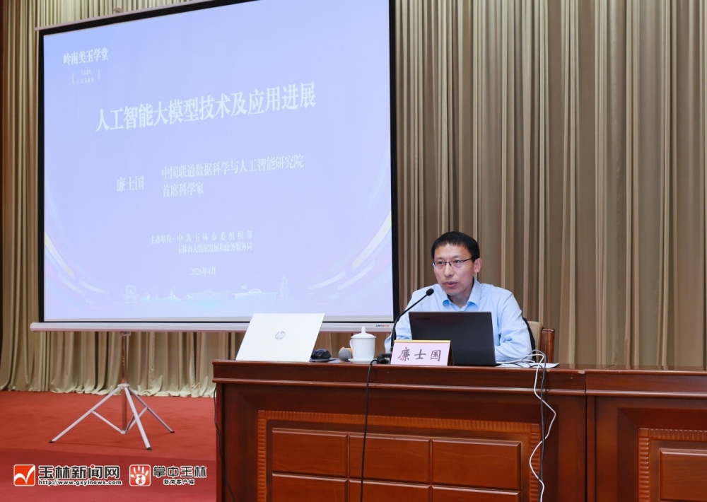 玉林新闻网-玉林日报讯 (记者 梁华)4月16日,岭南美玉学堂(第12期,总第54期)在市文化艺术中心举行。中国联通数据科学与人工智能研究院首席科学家、国务院国资委“百—万—百万”科技人才培养工程顶尖人才廉士国应邀作专题报告。市委书记王琛、市长张惠强出席。