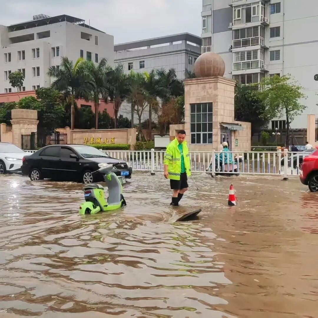 受强降雨影响,辖区多条路段积水严重,积水深度没过脚踝。其中教育东路检测站、人民东路与石牛路口、棠梨路华景园小区、石牛路奥园广场、文体路与人民东路路口等重点易涝区域,积水漫延路面,严重阻碍车辆、行人正常通行,存在安全隐患。面对疾风骤雨,一线工作人员不惧艰险、分工协作、有序作业:他们有的掀开排水井盖,有的徒手清理排水口枯枝、杂物、淤泥,疏通排水通道,加速路面积水排空退去。经过紧张高效处置,截至当日上午9 时,辖区主要易涝点位积水基本消退,道路交通秩序全面恢复通畅。