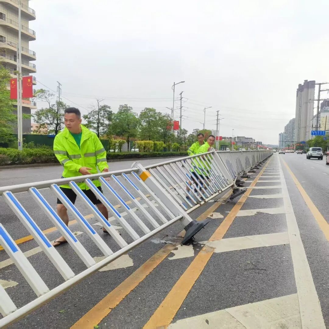 雨歇风停,善后整治无缝衔接。身着橙色工装的环卫工人全员上岗,手持清扫工具,清理雨水冲刷滞留路边的垃圾、落叶与杂物,还原街巷洁净面貌;园林养护人员巧用绳索、电锯,妥善移除倒伏苗木,扶正加固倾斜树木,消除绿化安全隐患;市政维修人员齐心协力,规整扶正受损歪斜防护栏,修复城市基础设施。