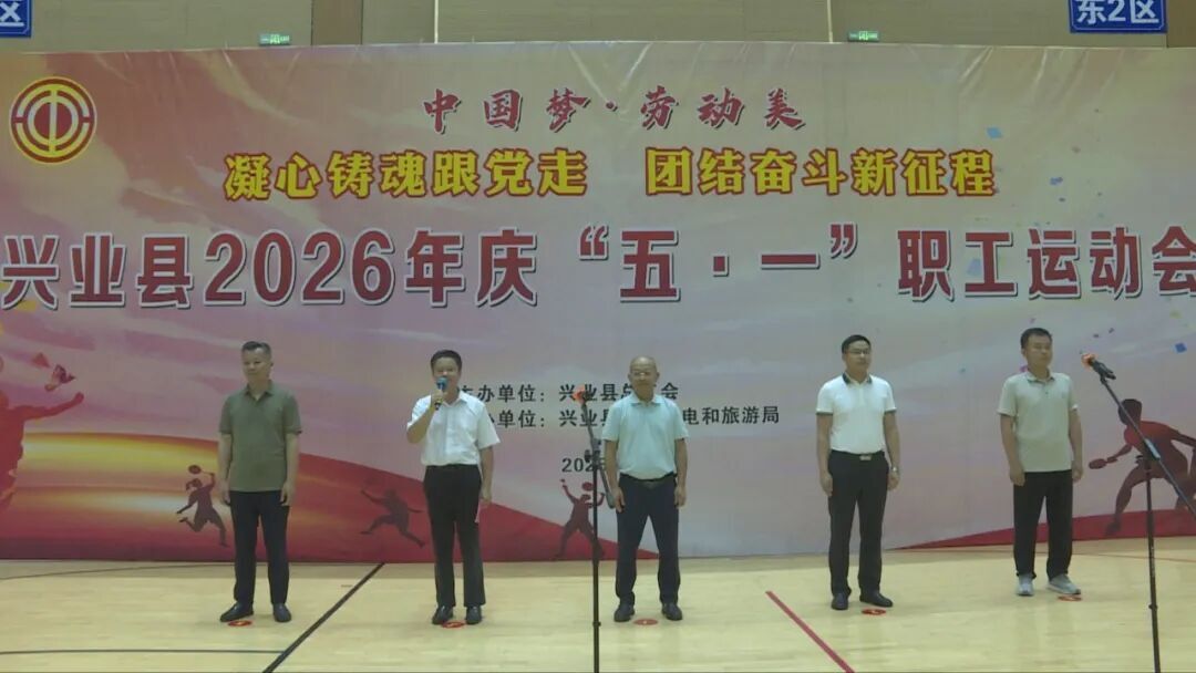 为丰富职工业余生活、凝聚奋进力量,4月8日晚,兴业县2026年庆“五·一”职工运动会开幕式在城南体育馆举行,县人大常委会副主任、县总工会主席周鸿杰,副县长梁晓出席活动。
