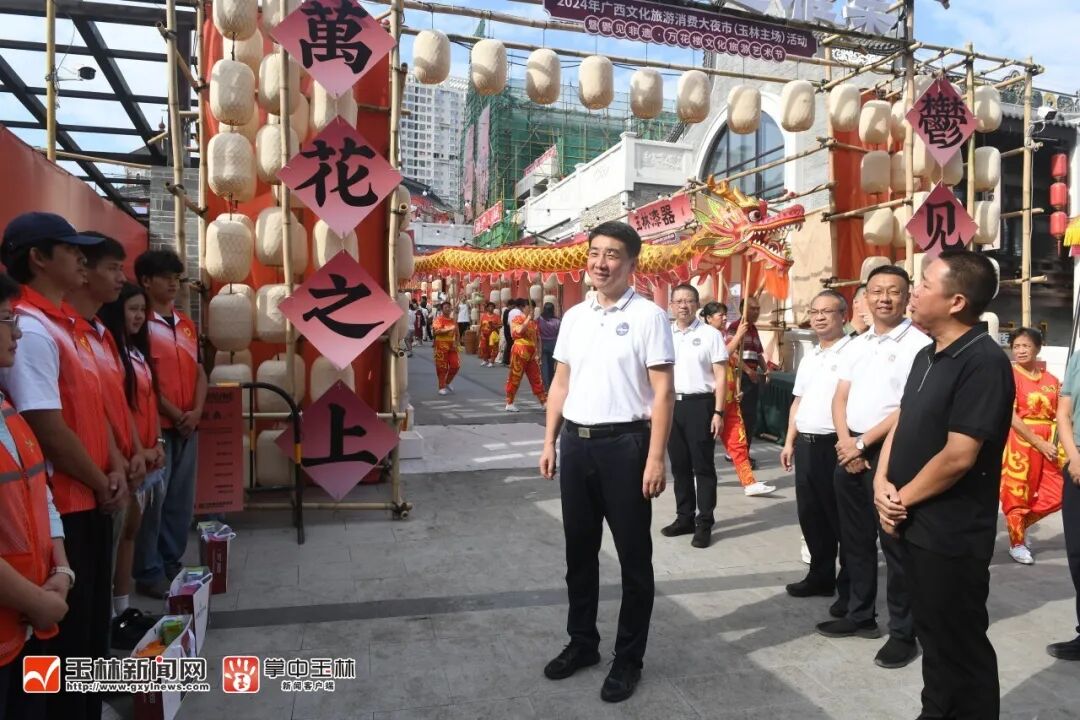 万花非遗雅集人来人往、十分热闹。“感谢大家的坚守和付出,你们辛苦了!”王琛来到现场,看望慰问坚守一线的公安民警、城管执法人员、社区干部、志愿者,并参观了万花非遗雅集,观看了州珮功夫展示,详细了解国庆假期文旅市场运行情况。王琛表示,国庆假期,第二届玉林十字街城事文化艺术节、鬱见非遗·万花楼文化旅游艺术节等助推了玉林城市热度进一步提升,这都离不开大家坚守岗位付出的辛勤汗水,要关心值班值守人员,合理安排调休,让他们以良好的精神状态投入到下一步工作中。王琛要求加强万花楼管理,淡化商业氛围,弘扬优秀传统文化,让城市留住记忆;强化产业思维,认真策划活动,进一步拉动玉林产业发展;加强城市管理,维护市容秩序,引导摊贩规范经营,让城市更有“烟火气”。