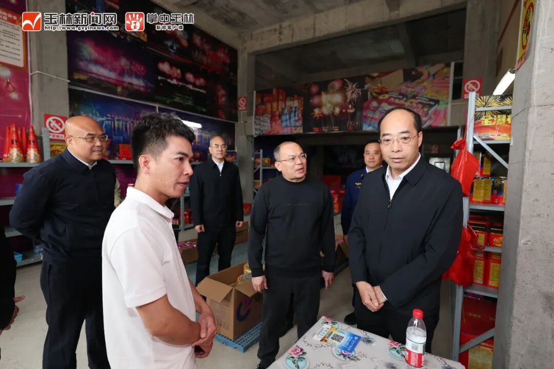 在北流市李东烟花爆竹零售店、北流市陆昌科烟花爆竹零售店,张惠强实地检查烟花爆竹储存、消防设施配备、“五个严禁、三个务必”要求落实等情况;在北流市安泰顺烟花爆竹专营有限公司,张惠强仔细察看库区安全设施配备,详细了解烟花爆竹存放数量、堆码高度及运输管理情况,听取企业负责人关于储存安全监管工作的汇报,对发现的问题要求立即整改。他强调,企业必须切实扛起安全生产主体责任,严格执行仓库安全管理规定,加强从业人员安全教育,加大安全投入,完善防护设施,坚决杜绝超量储存、混存混放等违规行为,确保万无一失;零售店经营业主要把安全放在第一位,坚决杜绝麻痹思想和侥幸心理,严格遵守储存和销售相关规定,积极开展安全知识宣传,引导市民群众安全燃放、文明燃放。各级各相关部门要深刻吸取近期事故教训,坚持举一反三、防患未然,落细落实“五个严禁、三个务必”要求,扎实开展风险隐患排查整治,切实做好烟花爆竹生产、运输、销售、燃放全链条安全监管。要严格落实相关规定,加强烟花爆竹零售店(点)、储存点现场管理及周边安全管控,严防“下店上宅”、超量储存、店外摆放、人员聚集,加强重点场所检查排查,严防违法违规存储烟花爆竹,严厉打击非法储存、经营烟花爆竹等行为。要加强宣传引导,严格做好烟花爆竹从业人员的安全教育提醒,广泛普及相关安全知识和禁放、限放规定,持续提升公众安全意识,营造全社会共同参与的安全管理氛围。
