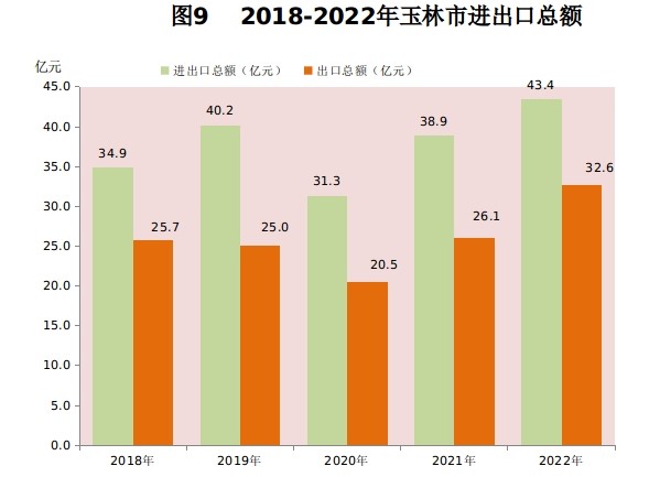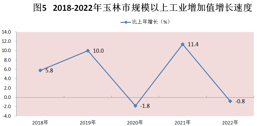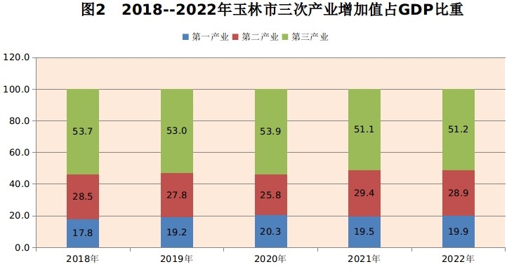 2022年玉林市生产总值(初步核算数)2167.46亿元,按可比价计算,比上年增长2.5%。其中,第一产业增加值430.67亿元,增长4.6%;第二产业增加值625.46亿元,增长1.3%;第三产业增加值1111.33亿元,增长2.3%。第一、二、三产业增加值占全市生产总值的比重分别为19.9%、28.9%、51.2%,对经济增长的贡献率分别为37.9%、13.5%、48.6%。