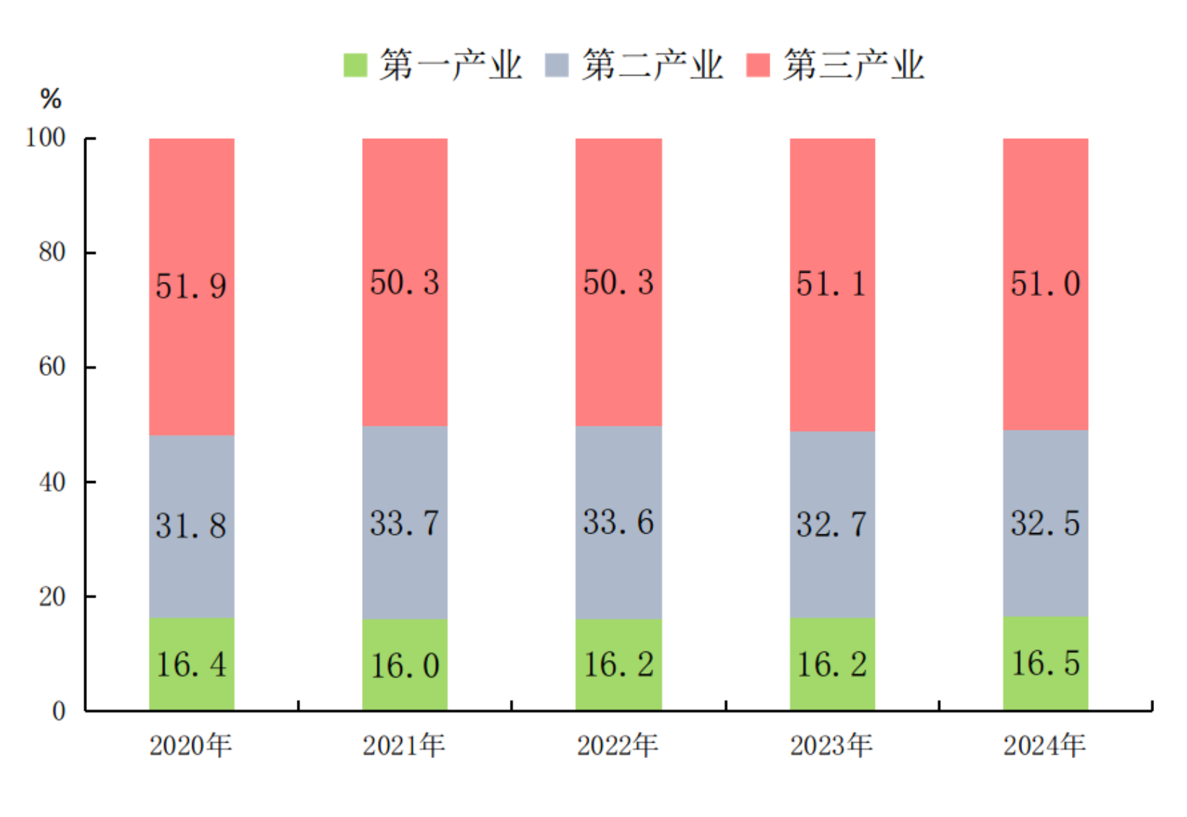 图2 2020—2024年广西三次产业增加值占GDP比重