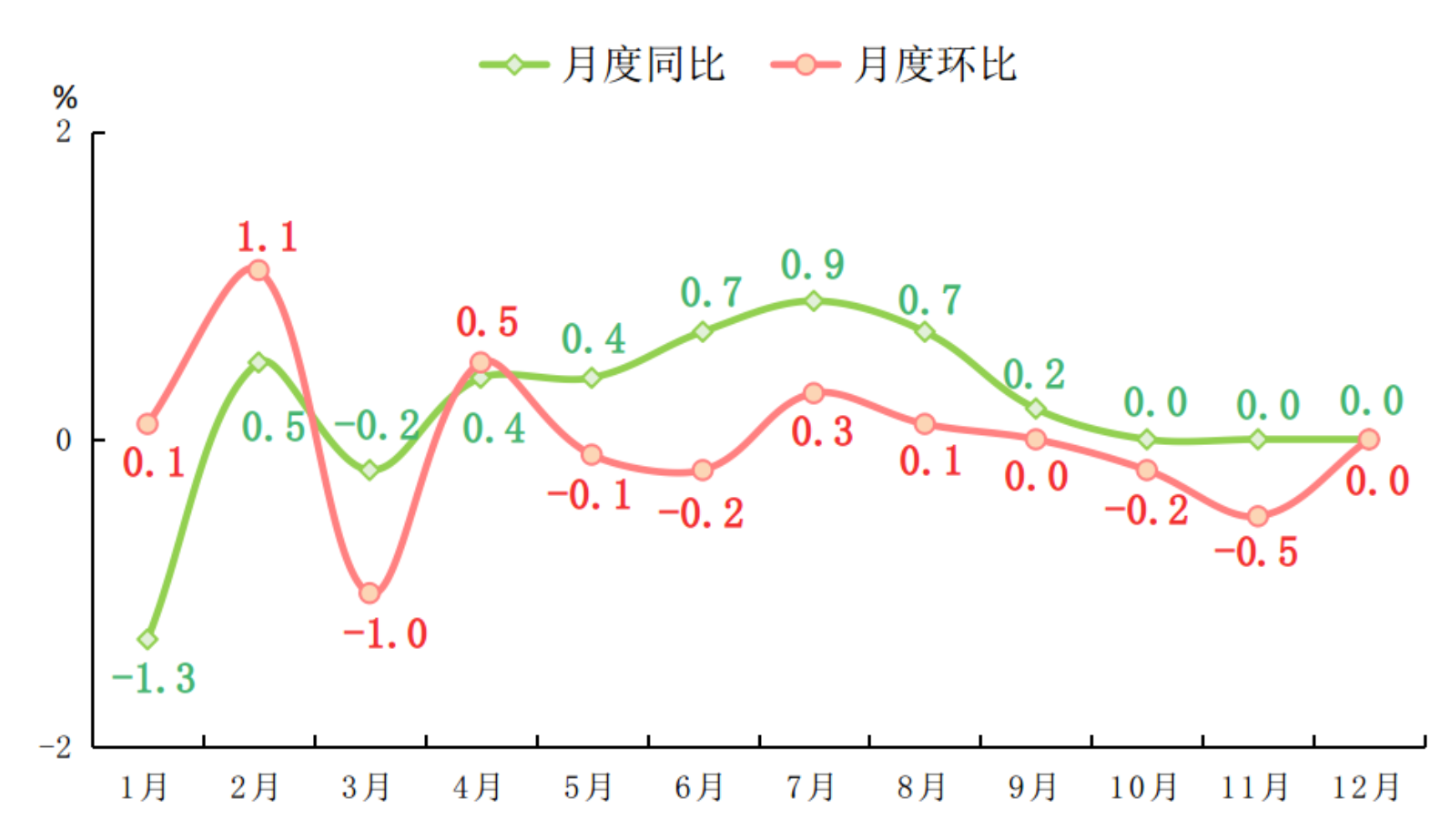 全年居民消费价格比上年上涨0.2%。工业生产者出厂价格下降1.9%。工业生产者购进价格下降2.9%。农产品生产者价格[7]上涨3.1%。